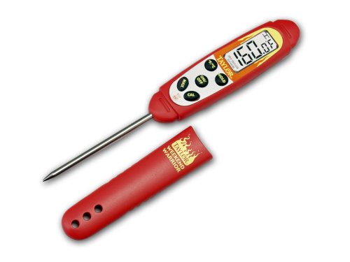 Taylor's top rated Weekend Warrior Digital Thermometer will be the star of your BBQ tools and the best kitchen thermometer you'll own. The backlit LCD screen is easy to read even in the dimmest of light. From braised and broiled to grilled, fried, and roasted, cook meat to juicy perfection with this convenient kitchen essential. Quickly and accurately responding to temperatures from -40 to 450 degrees F (-40 to 230 degrees C), the compact digital thermometer guarantees that poultry, beef, and seafood get cooked to a safe internal temperature and the desired doneness, allowing for superior flavor while lending peace of mind. The unit features on/off and temperature-hold buttons, a min/max temperature memory, and an auto-off function, plus it can be recalibrated to maintain accuracy. Other highlights include a stainless-steel probe, a protective antimicrobial sleeve to inhibit bacteria growth, and a backlit LCD screen for easy reading even under low light. Furthermore, the handy tool provides waterproof construction, making it safe around kitchen messes and a snap to clean. An included lanyard helps keep the thermometer close at hand while cooking. NSF-listed for professional use, the digital thermometer measures 6-3/4 by 1 by 5/8 inches. Powered by one LR44 lithium battery (included). Water resistant to splashing.