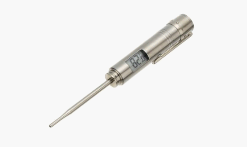 Digital wine thermometer in stainless steel that includes an led light. For the wine lover in your home or bartenders this professional high quality device has a pen clip. The top that allows it to go discreetly inside a shirt or coat pocket or purse. The LED light is great for lighting menus or reading labels. Lighted temperature display in Fahrenheit and Celsius Compact design in stainless steel is elegant and discreet LED light on one end adds additional help when needed. High quality finish